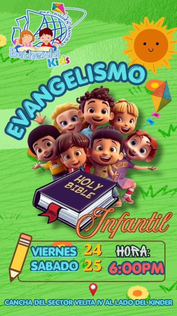 Coro, abril de 2025 – El departamento infantil Bethesda Kids, perteneciente a Bethesda Ministerios Internacional, ha confirmado la realización de una jornada especial de Evangelismo Infantil, dirigida a los niños y niñas de la comunidad. El evento se llevará a cabo el viernes 25 y sábado 26 de abril a partir de las 6:00 de la tarde, en la cancha de La Velita IV, ubicada al lado del Kinder, en la ciudad de Coro, municipio Miranda del estado Falcón.